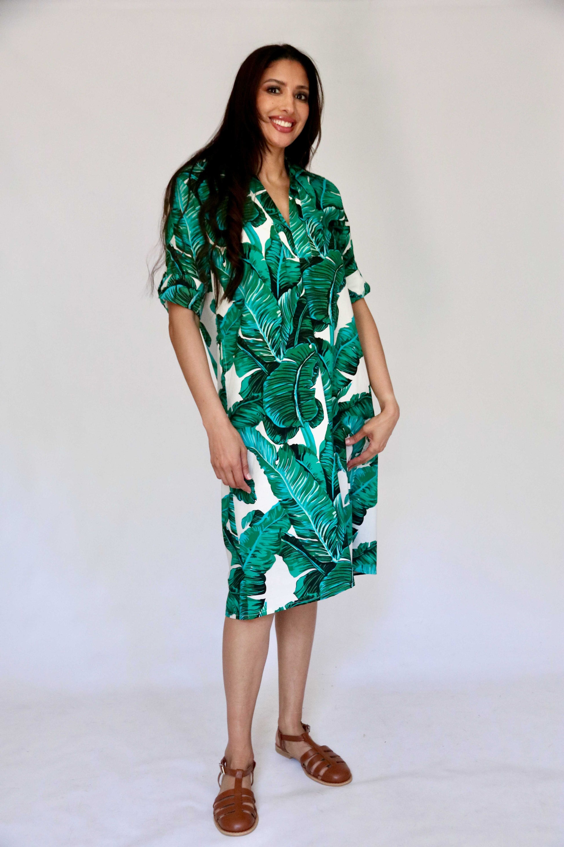 .. . Step into effortless style with this lush green foliage–print dress, crafted from 100% breathable cotton. Designed with front and back pleats, it creates a flattering A-line silhouette that moves beautifully with you. The classic collar adds a refined touch, while the 3/4 sleeves feature a roll-up detail with button tabs for versatile styling. Perfect for warm days and relaxed elegance.